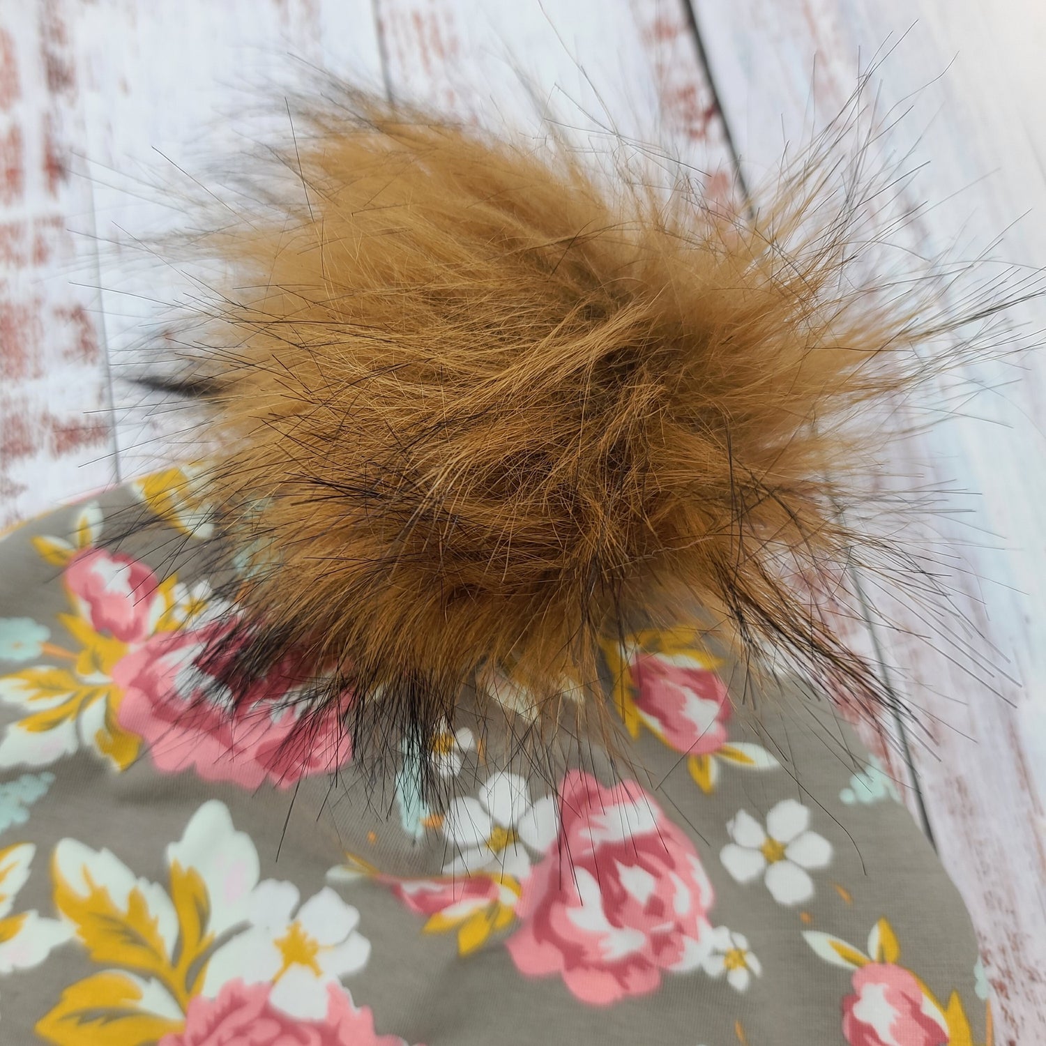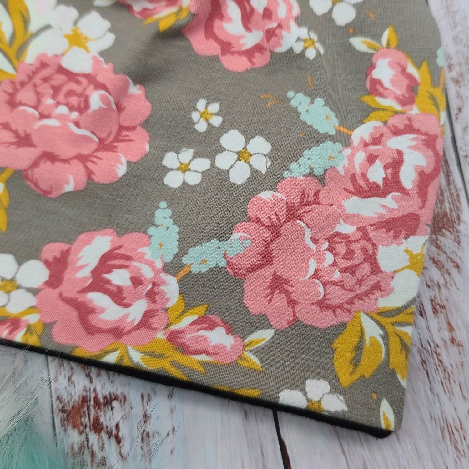 ADULTE - Tuque Printemps/Automne (JERSEY) Pompon amovible - Fleurs - Fonc couleur Sauge - Corail, blanc, moutarde et menthe